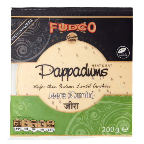Fudco Urad Jeera Papad - A premium selection in the papad & far far category, known for its exceptional quality. Note: Please check packaging for allergen information. Enjoy the authentic taste and quality. At AtoZ Grocers in Finchley, London, we supply a full range of Indian foods including exotic vegetables for domestic and commercial clients.